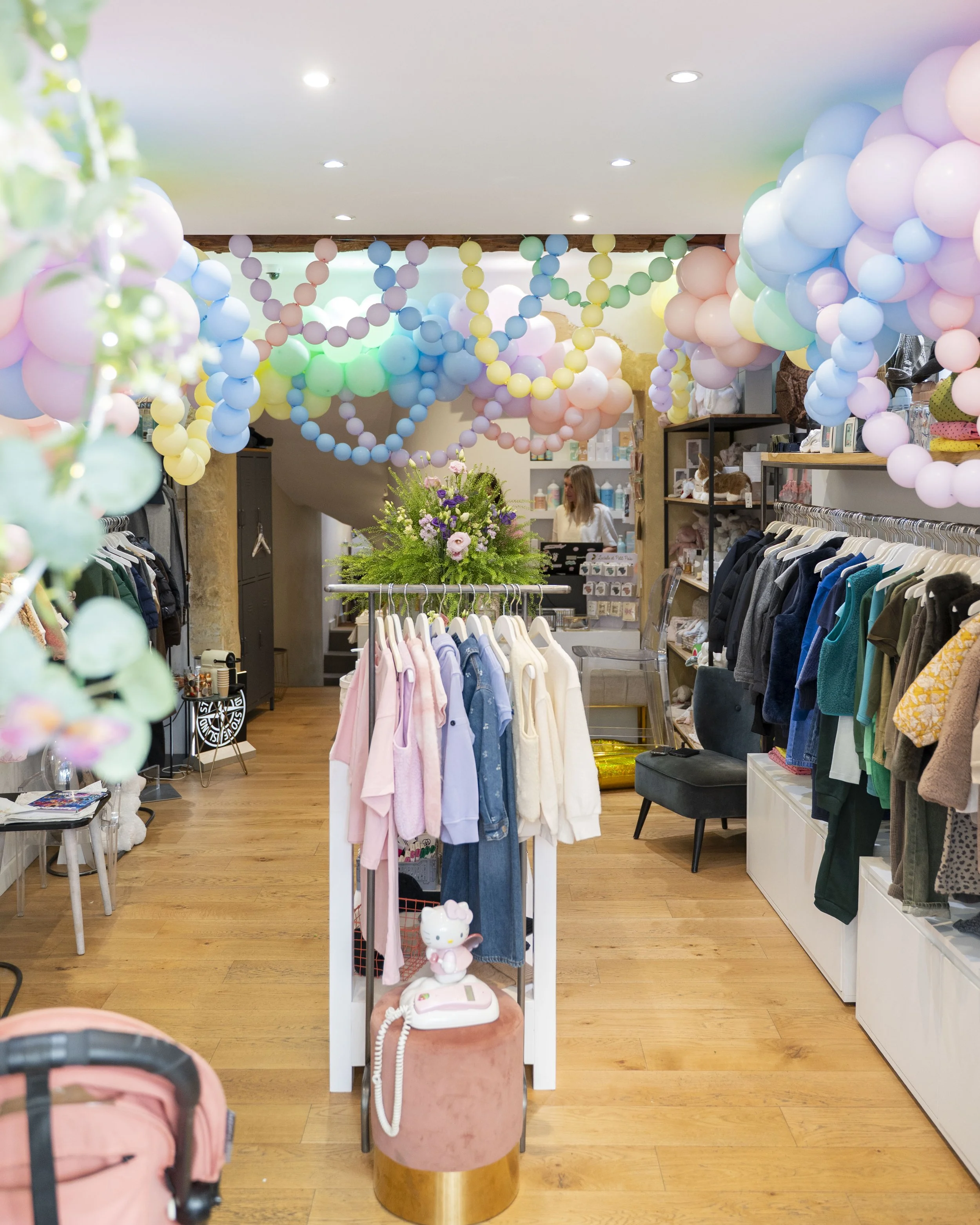En collaboration avec Pauline de Maistre, qui a orchestré l’événement, nous avons conçu un univers coloré mêlant ballons organiques, installation XL en façade, et détails floraux raffinés.