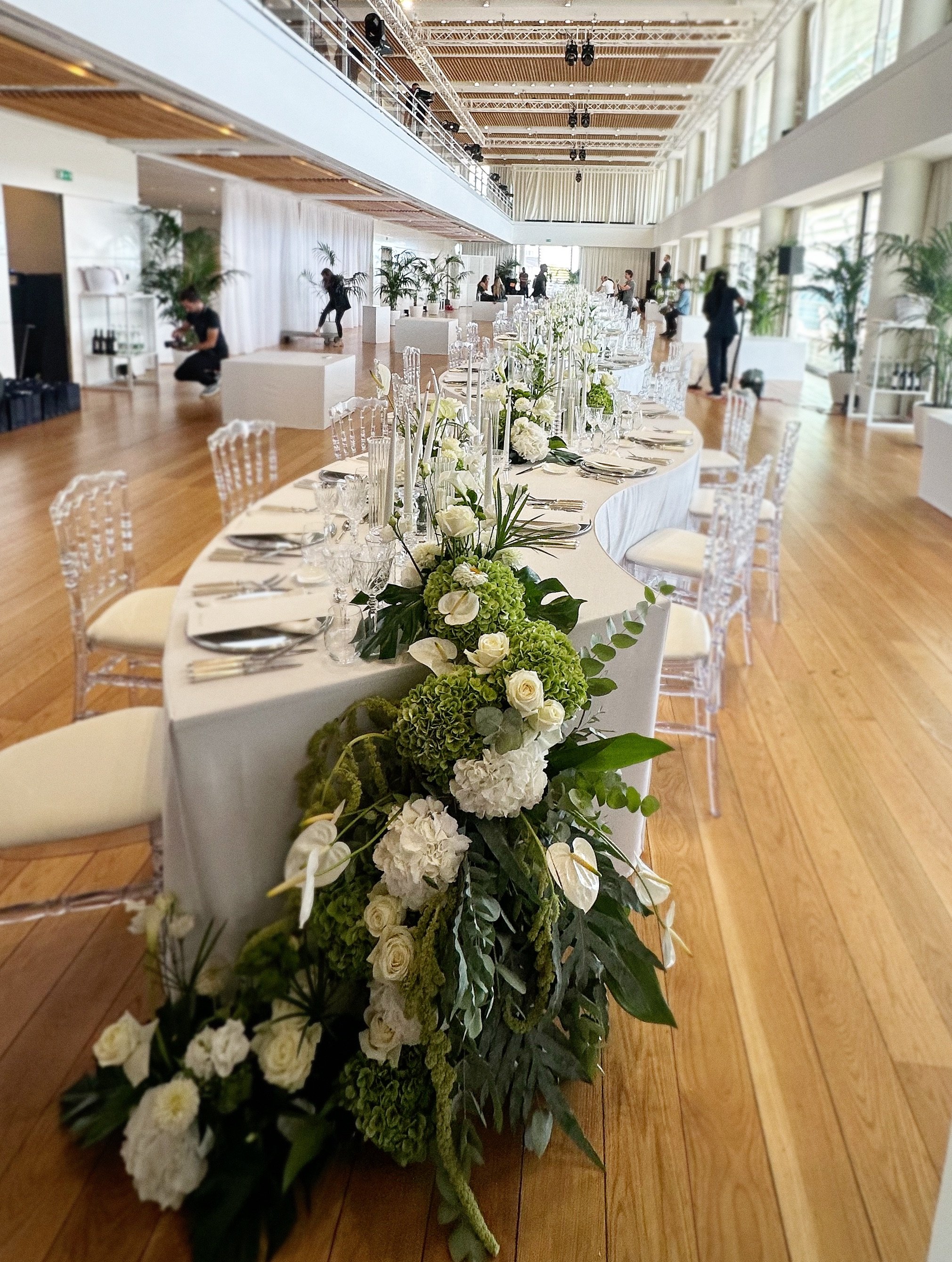 Un décor élégant et aérien où chaque détail a été pensé pour sublimer le lieu : compositions florales raffinées, cascades végétales et mise en lumière délicate.